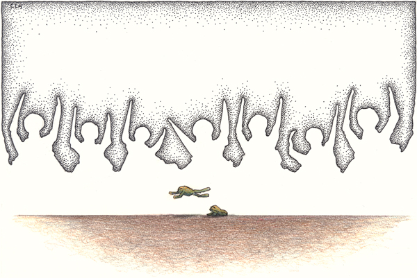 At the sound of the starter’s pistol, I took this picture just as the frogs were dropped at the start line and began to jump for the finish line, but it wasn’t long before the cheering started to subside as people started to realize you couldn’t tell the two frogs apart. Concern and disarray swept the crowd. Confusion over possible misplaced bets ensued. As the frogs crossed the finish line and the race ended, the crowd was in a near state of panic, the Judges and owners convened and it was determined that both frogs were twins, each going to a new home when tadpoles and each assuming a different last name, so no one knew they were related.