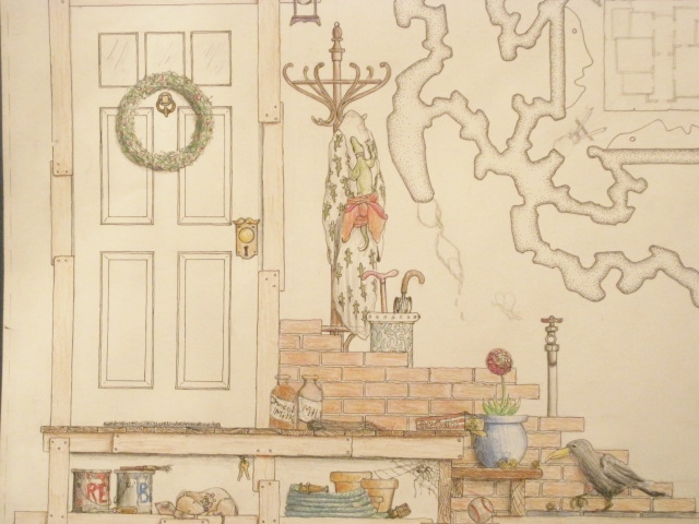 Herein is the second corner of the Pen & Ink worksheet with suggestions from viewers to “The House That Jack Built” project. This is a camera shot rather than a digital scan so coloring is different from the previous “2nd corner” post.