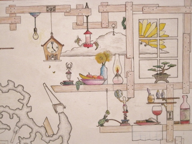 The above Pen & Ink worksheet is the Fourth and final of the four corners open for suggestions of items to be included in the final painting. Anyone new to the “The House That Jack Built” please scroll back to Monday’s June 16 (Week One) and June 23 (Week Two) Post for a description of this current project.