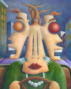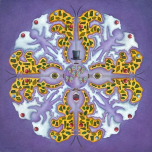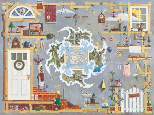 Shown is “The House That Jack Built” Painting which includes a menagerie of items that were suggested by many online followers to this audience participation art project.