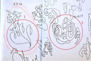 From the + 12 portion of this project, this ‘Doodle’, from 2012, was selected by good friend and fellow artist, Mattye. Mattye selected the ‘Doodle’ circled in red, #1. My first attempts at creating a design for the doodle proved problematic. I made several reasonable attempts and finally decided on one for a worksheet. I even started the painting but indecision persisted and I set it aside. A few months ago, I was working in my current sketchbook and doodled a design that intuitively directed me to add a modified version of Mattye’s selection, shown in Circle #2. This new take on her ‘doodle’ selection seemed to work where all other past attempts left me unsatisfied.