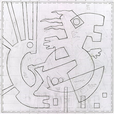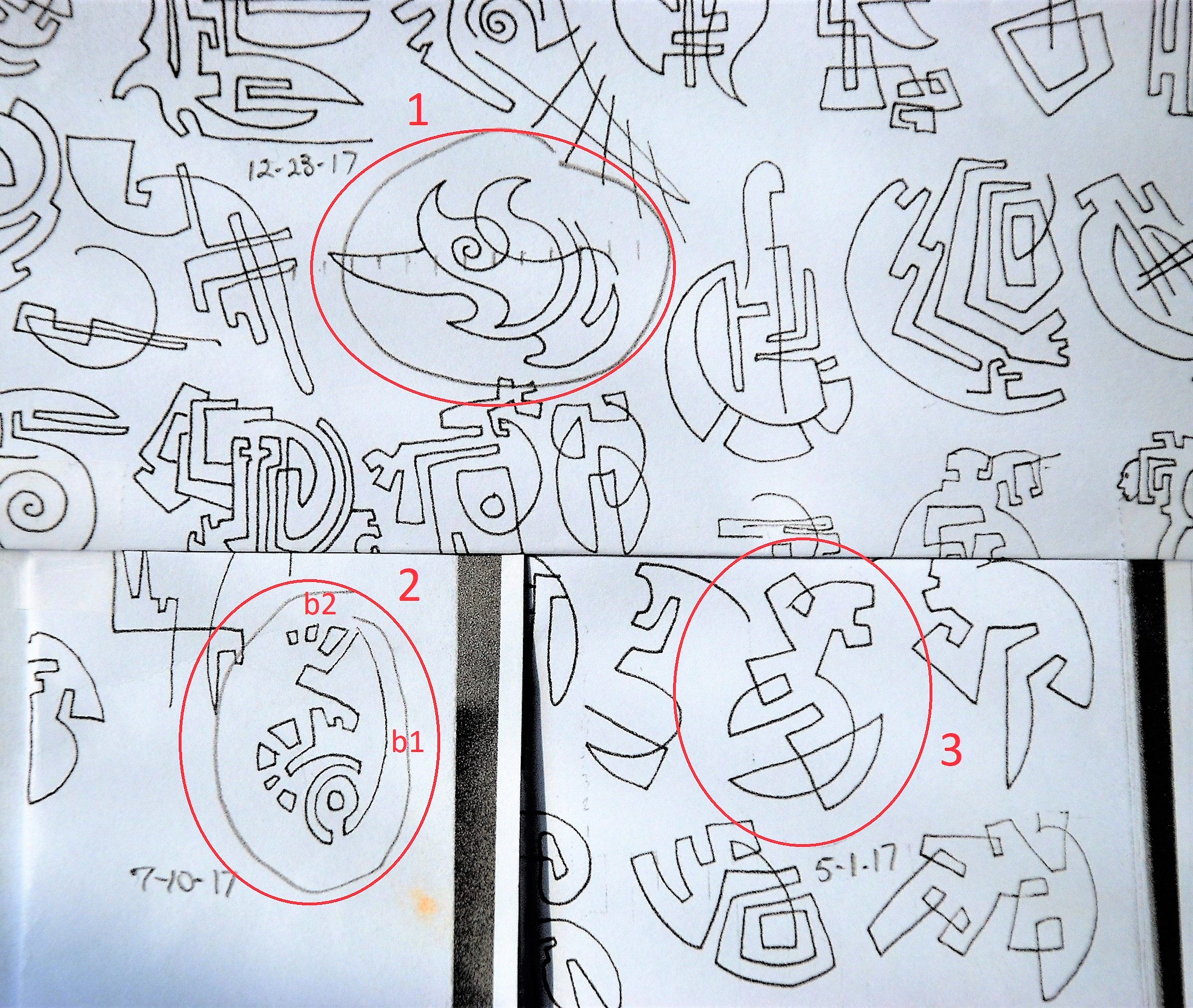 I mentioned in last weeks ‘Doodle’ posting that there was a particular design issue confronting me. On ‘doodle’ #1, there were seven receding layers (shapes) that I wanted rework to get just three layers. Shown to the left on this worksheet is that solution. Three layers but I managed to give the appearance of more layers by connecting some of the shapes rather than them all overlapping each other.