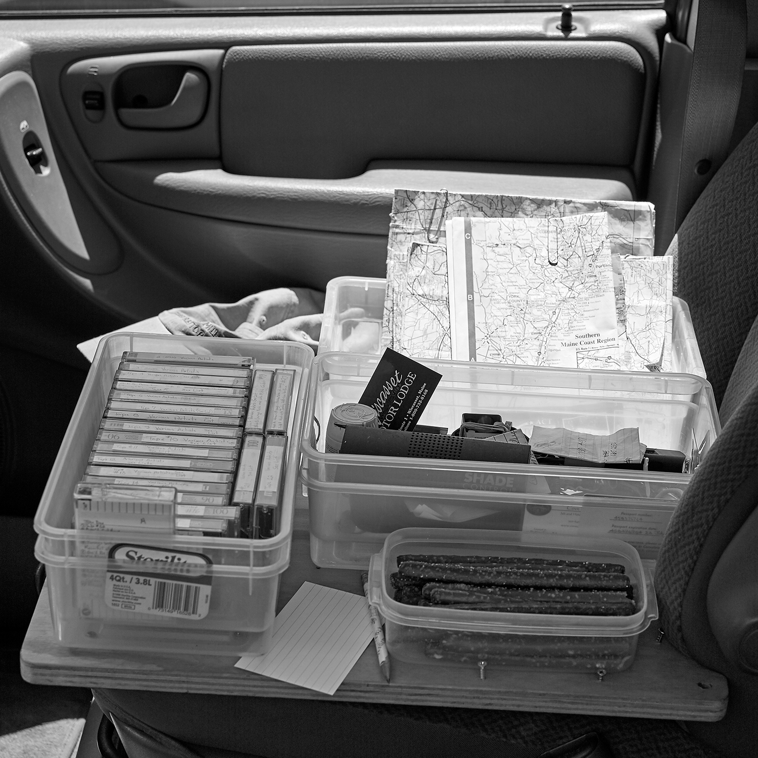 “The Journey to Ukazoo” books has been published and are now in the process of being either hand delivered or mailed. Image shown is one of 5 photos used on the back cover of the book. This is my front-seat setup for long solo trips and yes those are cassettes, lol. Still have them and they work well for me on long drives.