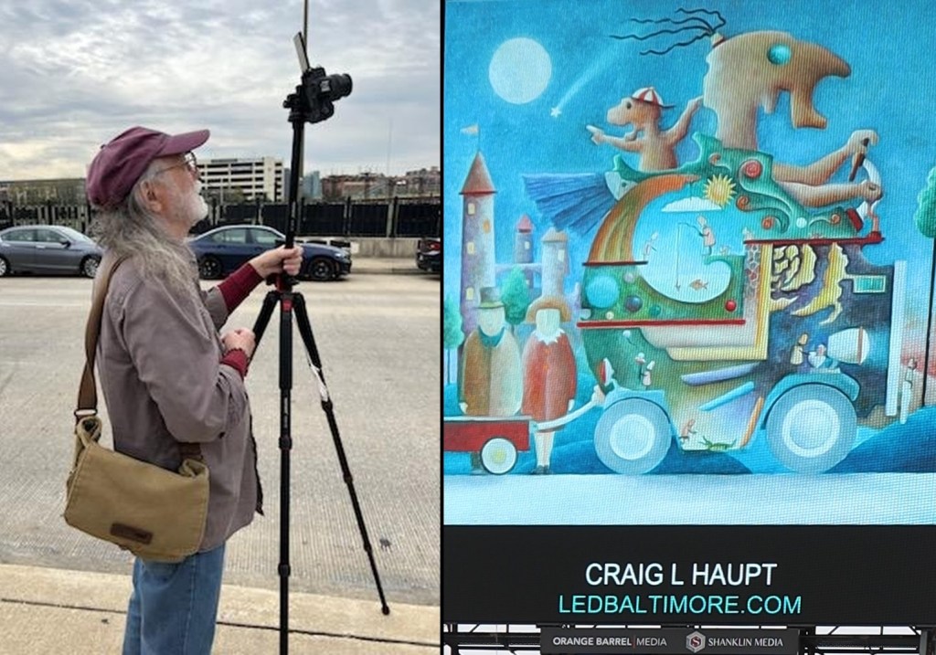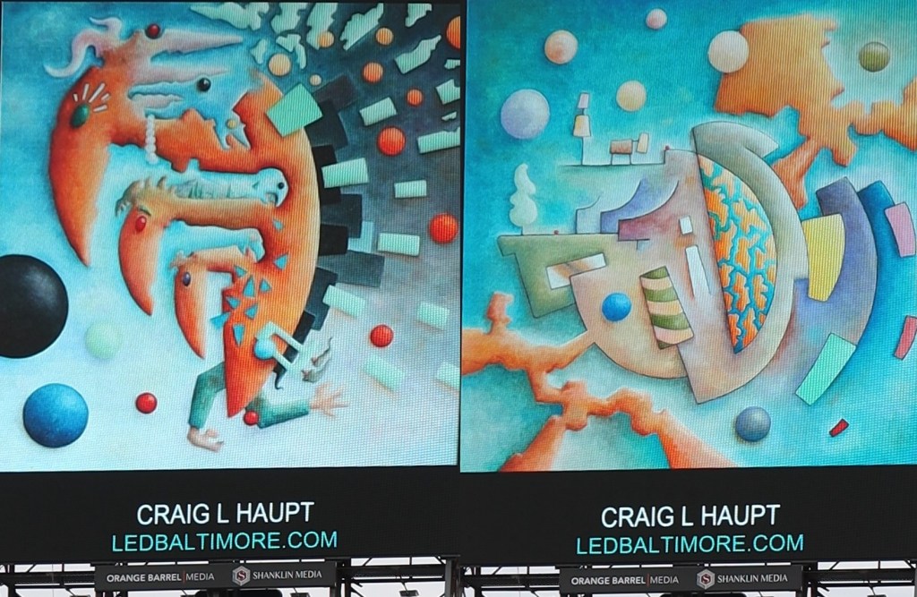 A good friend, Lee, and I took a drive down to Penn Station/Metro Gallery to see my artwork display on the 50 foot tall LED Baltimore Billboard. I took a film clip of the rotation of the 5 images to give you a view.