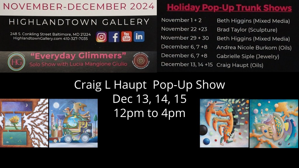 Three of the paintings are to be shown Dec 13-15th at the Highlandtown Gallery Pop-Up show. The one image in top pair. The two images in the middle set.