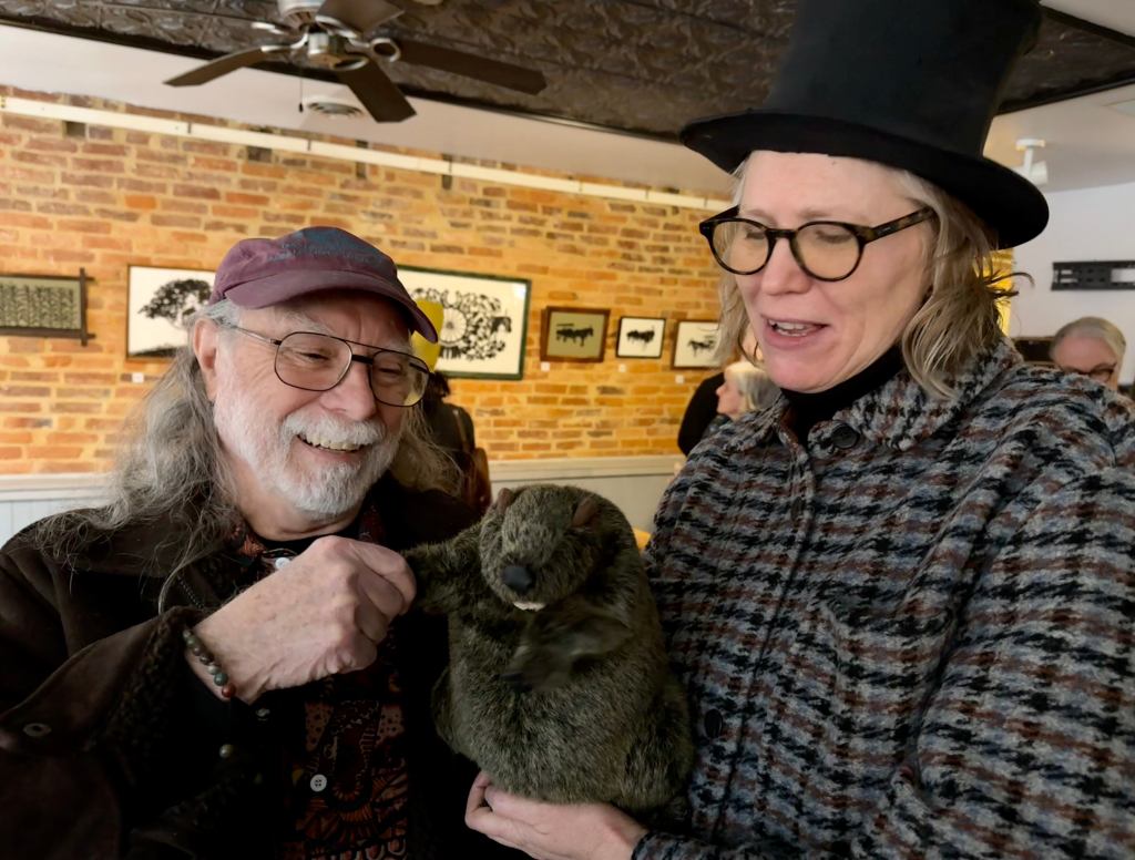 Took in an art exhibit Sunday featuring artist Katherine Fahey. Met some friends I haven’t seen in a while and introduced to a few other wonderful new artists. On top of that I got to meet up with ‘Hollins Holler’s’ famous groundhog of which he also didn’t see his shadow. Katherine, shown on the right, was kind enough to introduce me and got to shake his hand. Fun and rewarding event!